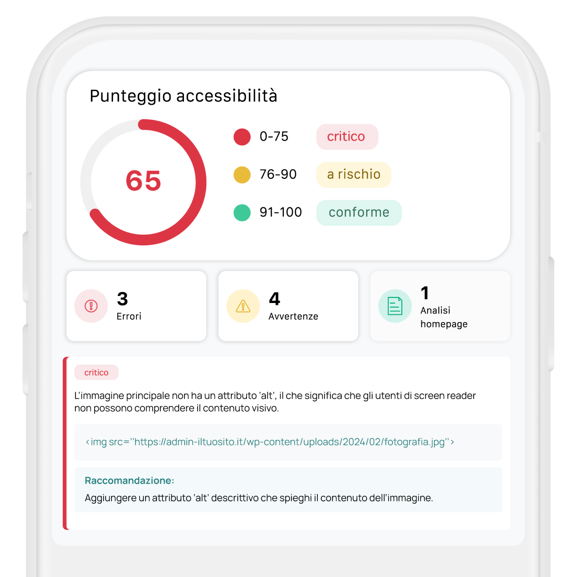 Compila il form per ottenere un'analisi gratuita dell'accessibilità del tuo sito e scopri se sei in regola con l'EU Accessibility Act, in vigore dal 28 giugno.